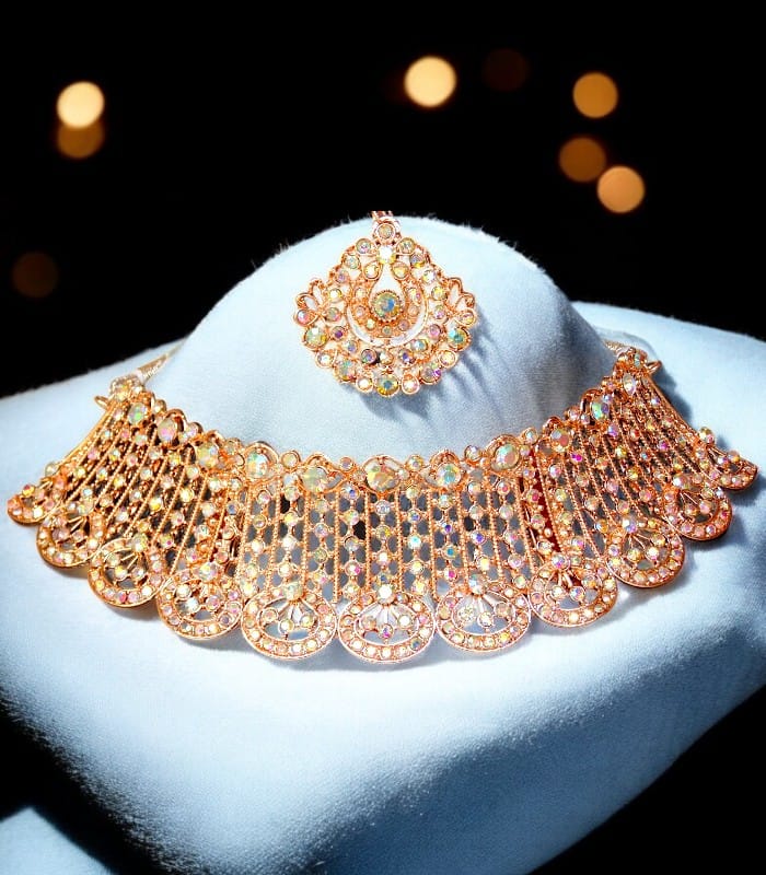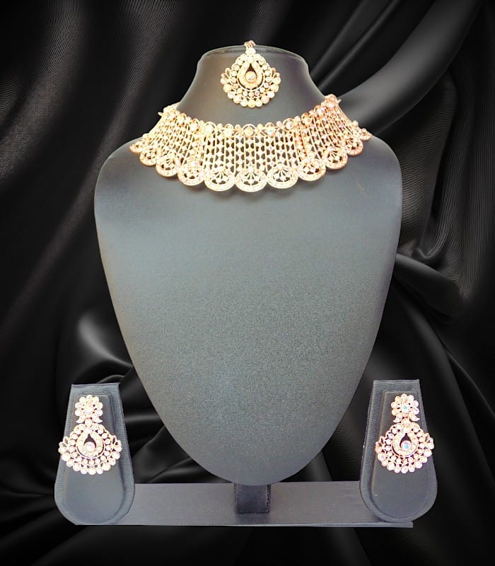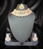 Make a bold statement with this elegant bridal choker set. Featuring a delicate yet intricate design, this set is adorned with sparkling stones for a luxurious appeal. Perfect for weddings and festive occasions, it adds grace and sophistication to any ensemble.