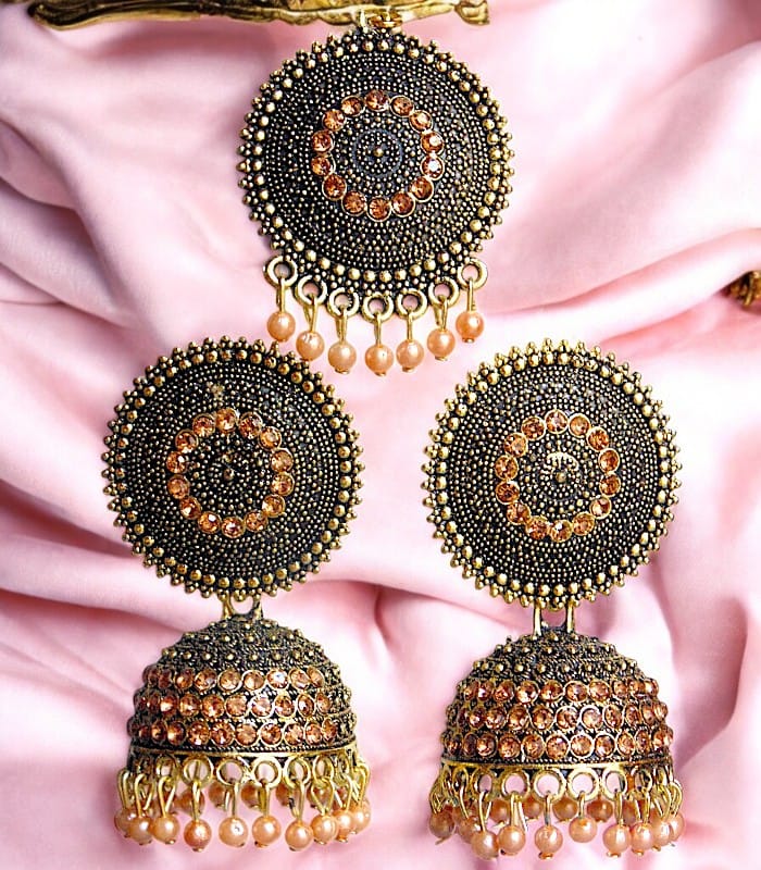 Bollywood Glamour: These jhumkas add a star-quality touch to your wedding attire, inspired by the glitz and glamour of Bollywood.
