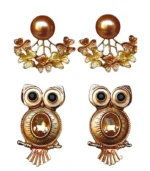Add playful elegance to your jewelry collection with the Butterfly Owl Earrings Combo. This set features two distinct yet beautifully coordinated earring styles. The first pair showcases delicate goldarn  butterfly motifs arranged around a bold gold bead, offering a graceful floral-inspired charm perfect for daytime wear. The second pair features adorable owl-shaped earrings with pearl enamel finish and a sparkling crystal centerpiece, adding a fun yet classy statement. Crafted with fine detailing and a premium gold-tone finish, this combo is ideal for styling versatility. Perfect for gifting or elevating everyday and festive looks with ease.
