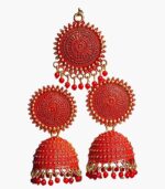 Embrace timeless heritage with these elegant gold plated jhumka earrings with mang tikka . Bollywood-inspired jhumka earrings bring star-studded elegance to your wedding attire. Crafted with intricate traditional Indian patterns in high-quality material, they add drama with their long, dangling design. A beautiful gift option, they make a memorable addition for brides, bridal parties, or anyone cherishing timeless style.