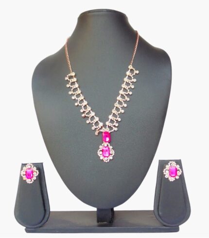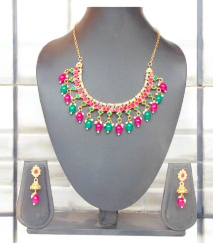 Gold-Plated Ruby & Emerald Bead Necklace Set with Earrings